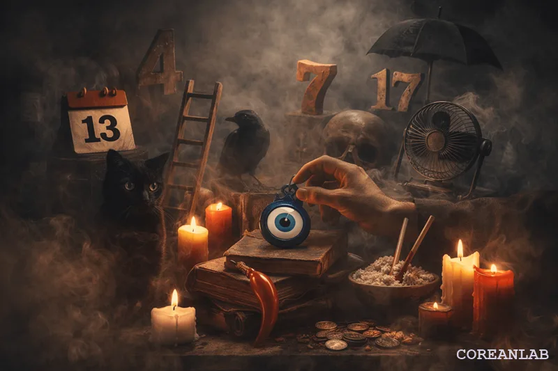한국의 미신은 대체로 실패·죽음 상징·기술 불안을 중심으로 생긴다. 진짜로 믿지 않아도 “굳이 리스크를 만들 필요 있나?”라는 심리로 회피한다.